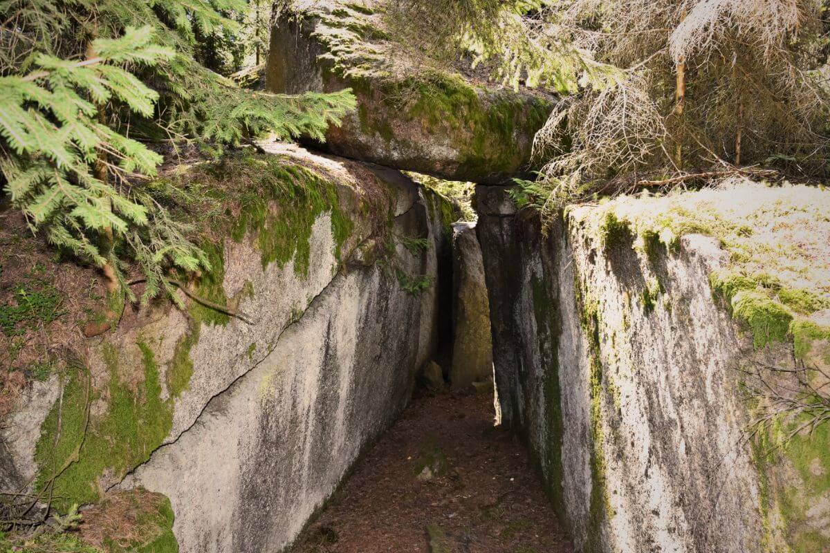 Die Steinerne Stube liegt im Wald in der Nähe von Großschönau. Mir sind keine geschichtlichen Überlieferungen bekannt. Die Vielzahl der Granitsteinblöcke wirkt tatsächlich so, als hätten Riesen sie durcheinander geworfen .